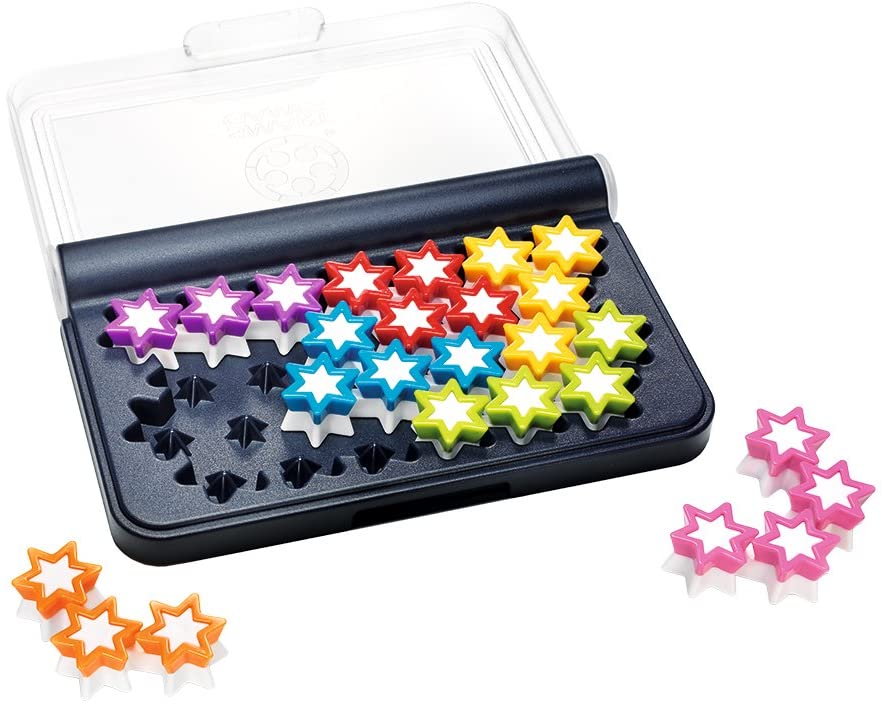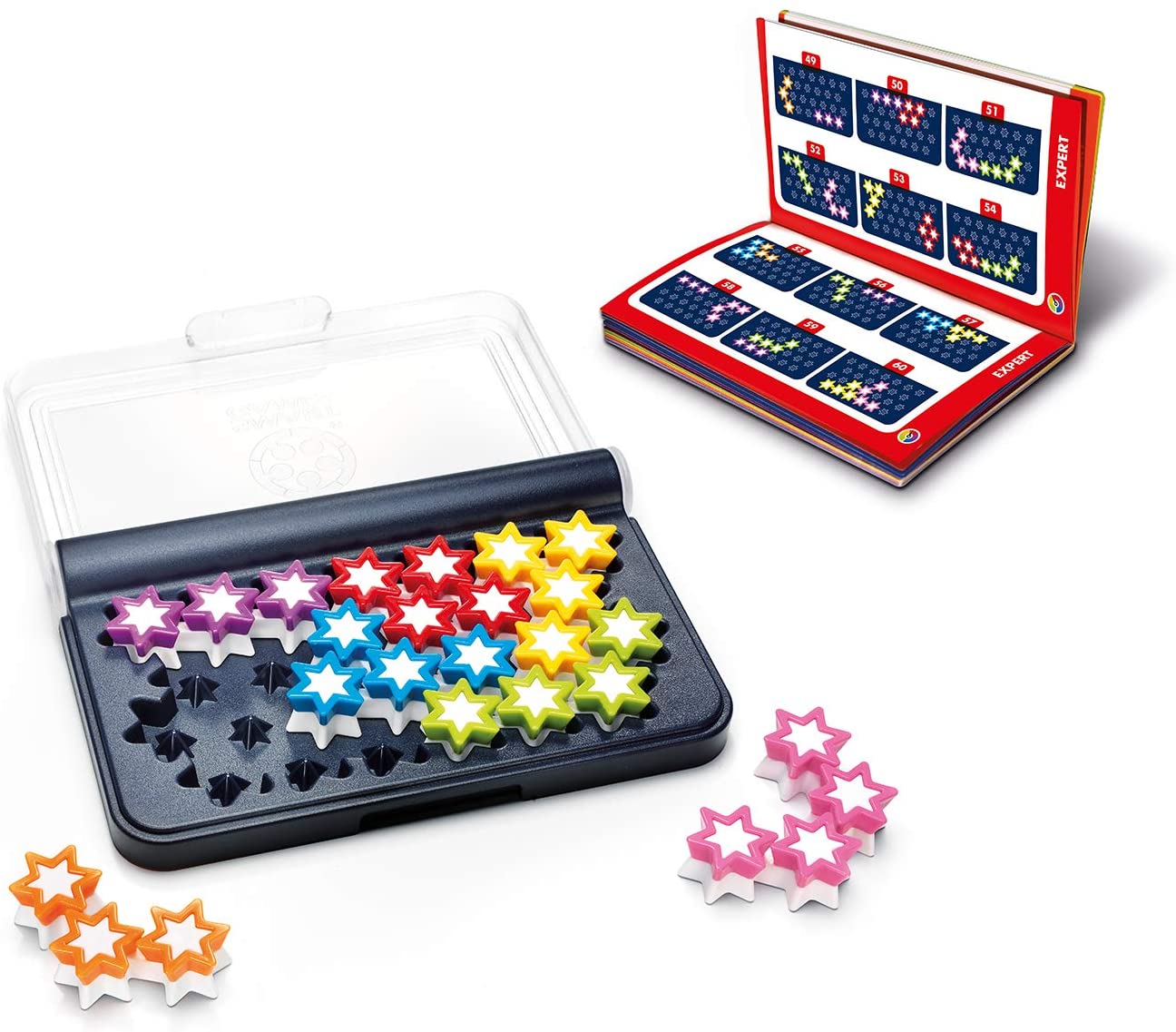 - Contents: 1 compact game board with transparent lid, 7 3D star pieces and corresponding pegs, and 1 booklet with 120 challenges and solutions.